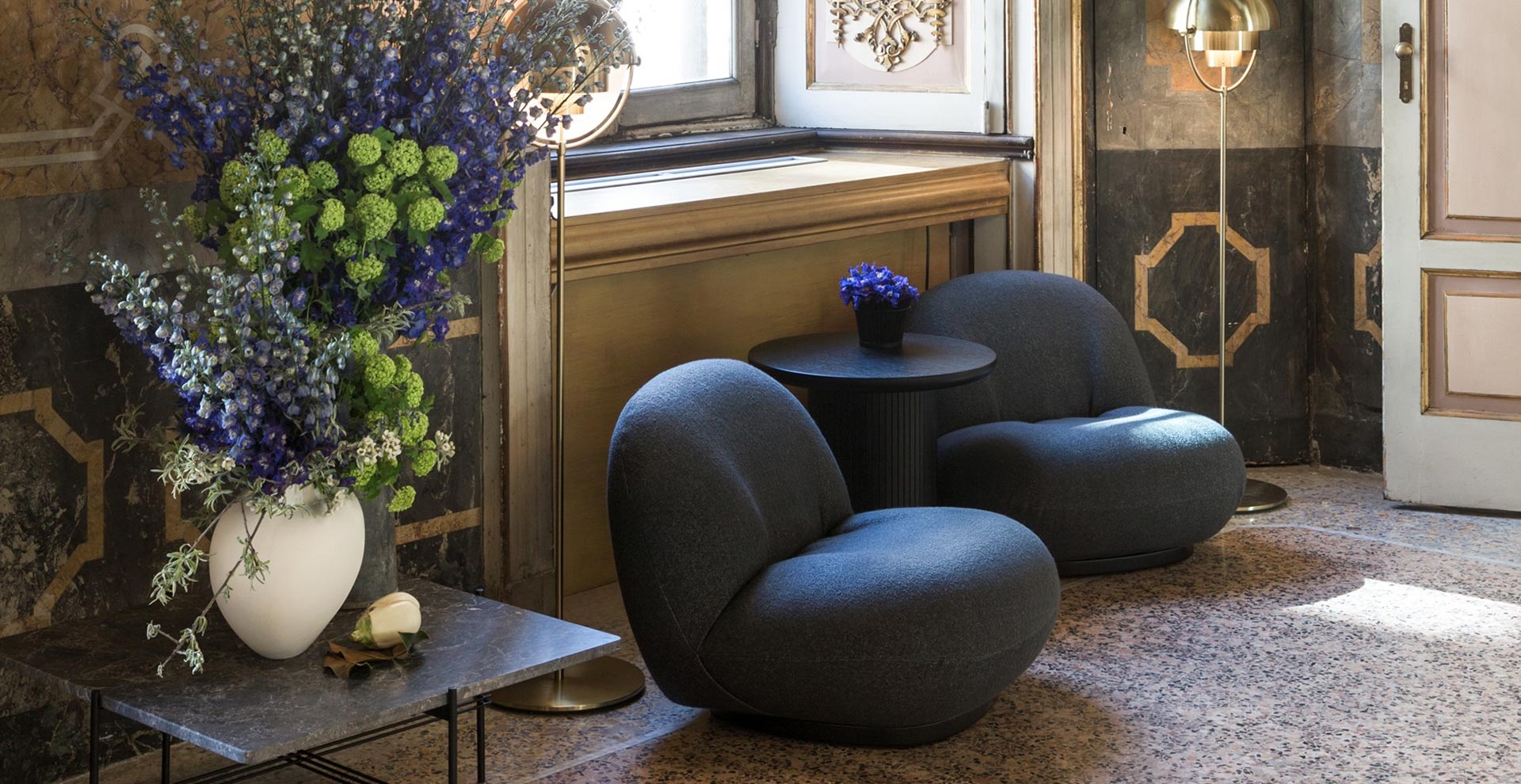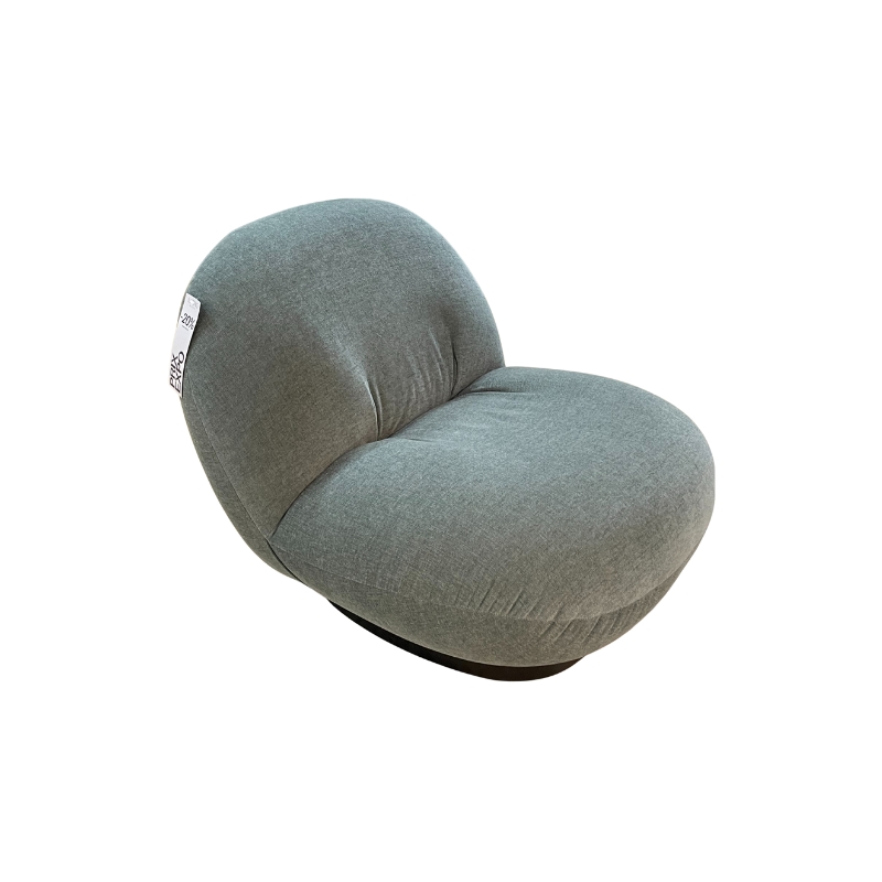 Fauteuil Pacha Lounge de GUBI, design iconique et confortable, pivotant pour une grande flexibilité. Revêtu de tissu Belsuede Special FR Dedar 12 finition Black semi-mat, parfait pour un salon ou un bureau contemporain. Vendu en l’état.