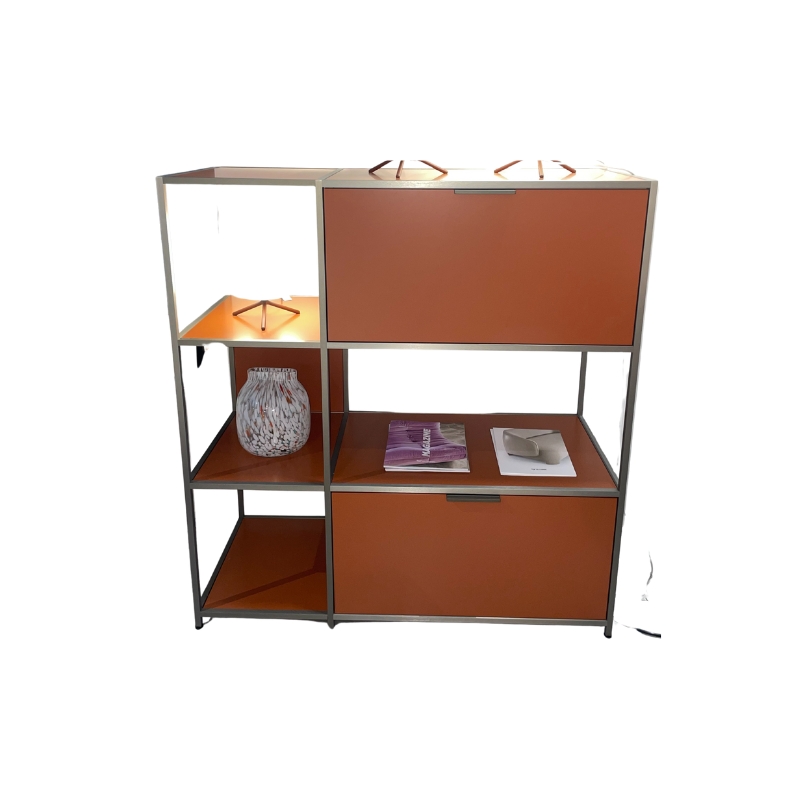Élégant module Dita System by Ligne Roset en finition cuivre. Compact et raffiné, il combine un tiroir bas et une porte abattante haute, idéal pour un salon, une entrée ou un bureau. Vendu en l’état.