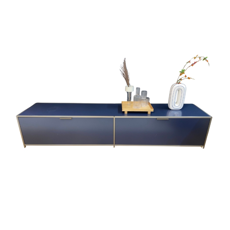Meuble TV Dita de Ligne Roset, alliant élégance et fonctionnalité. Revêtu d’un laqué bleu nuit, il offre un tiroir et une porte abattante pour un rangement discret. Design épuré avec montants en aluminium anodisé brossé finition bronze. Idéal pour un intérieur contemporain. Vendu en l’état.