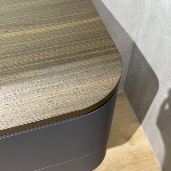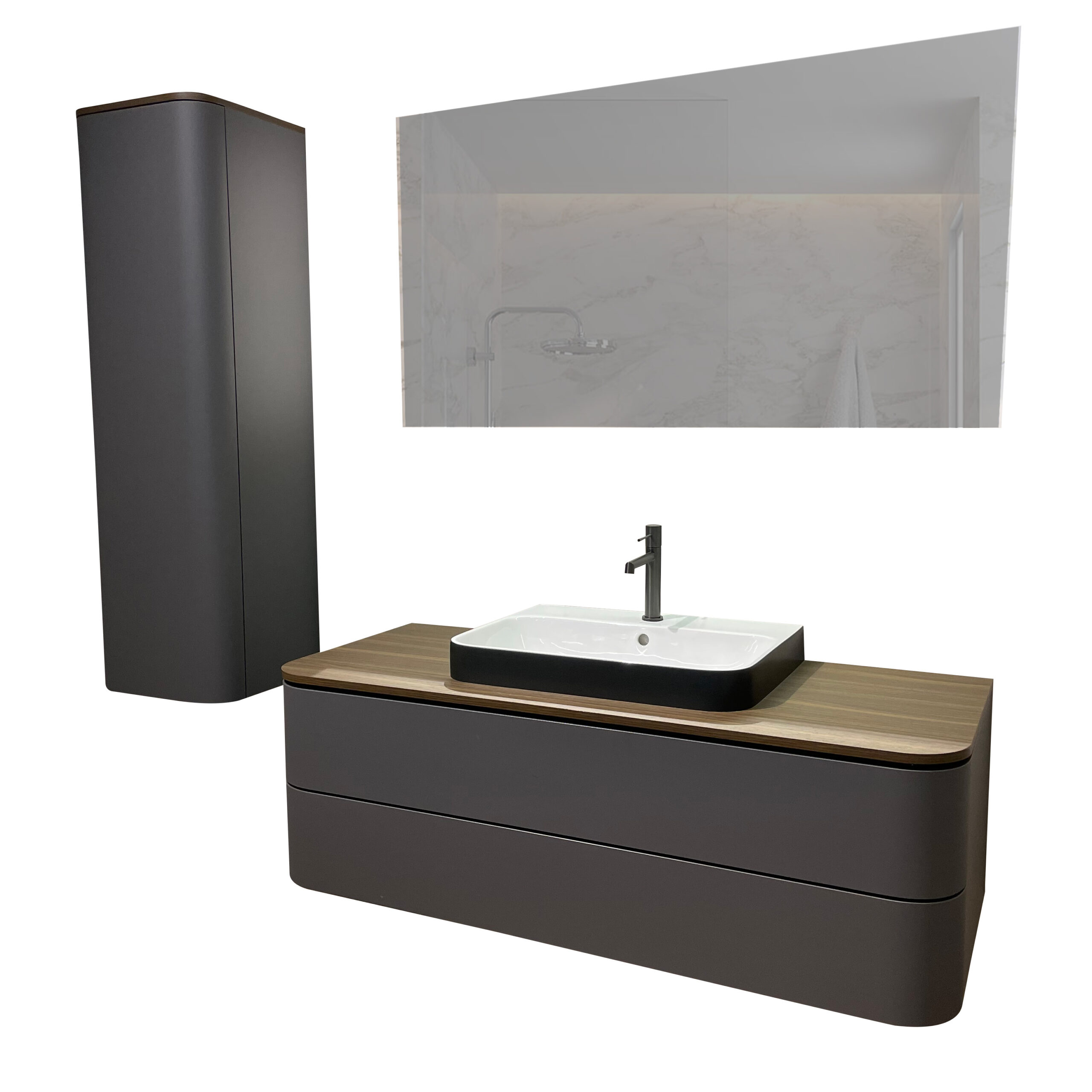 Coloris : plan bois noyer, vasque intérieur blanche et extérieur noir, meuble grafite super mat, colonne grafite super mat