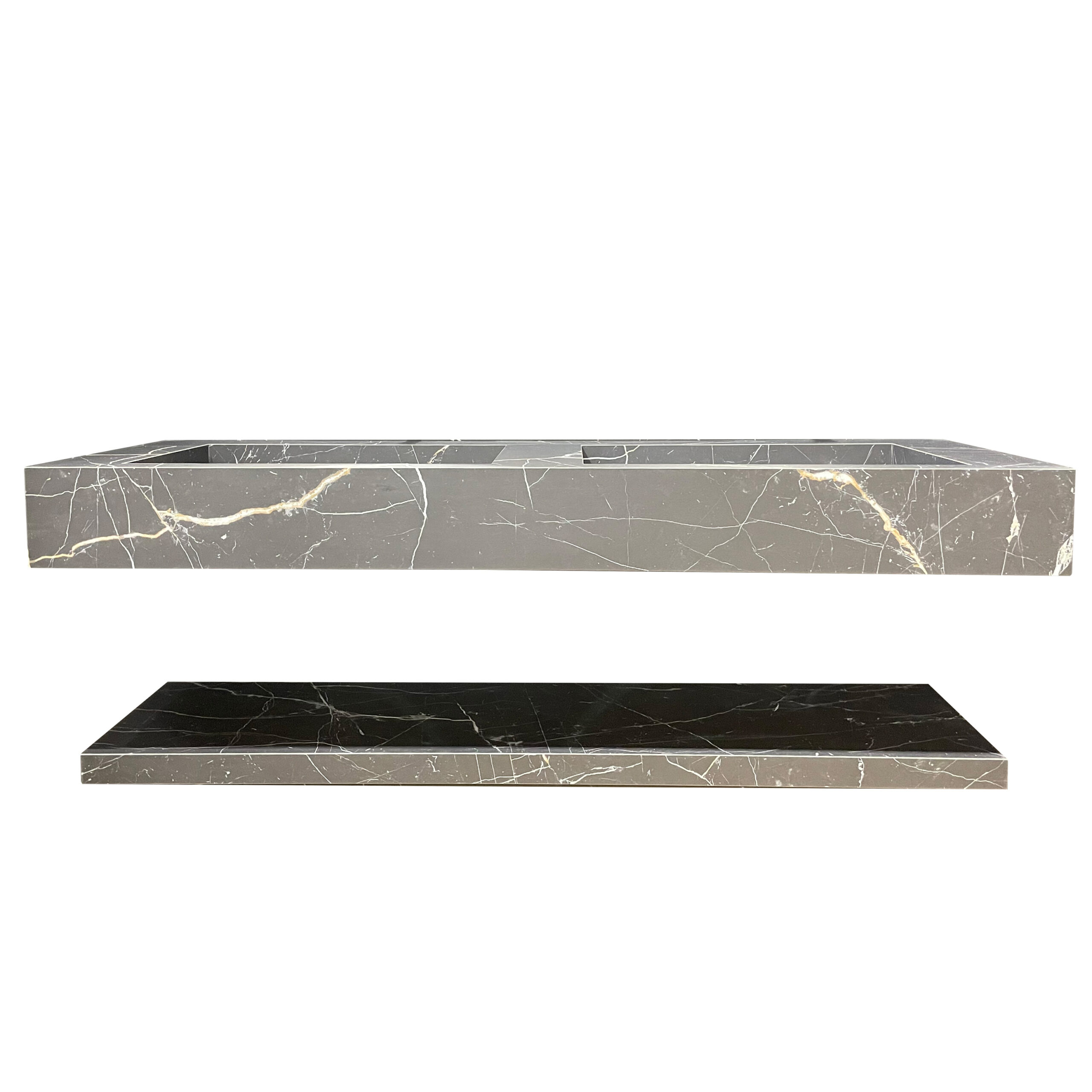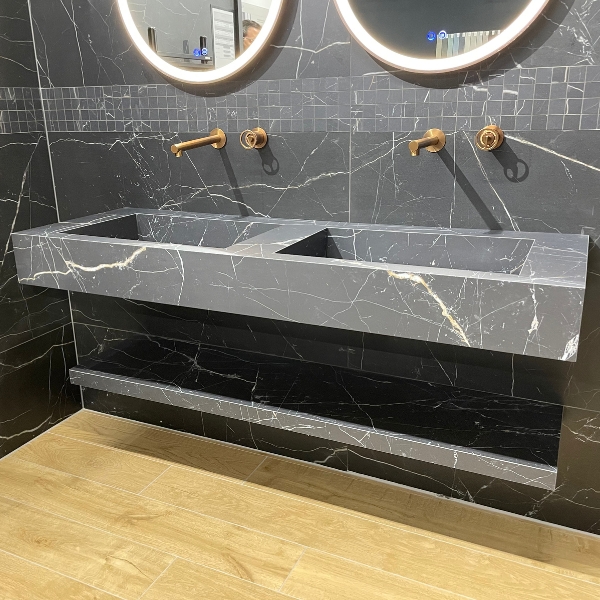 Dimensions : Double vasques : L.150 x P.50 x H.15 cm / tablette : L.150 x P. 35 x H.5 cm